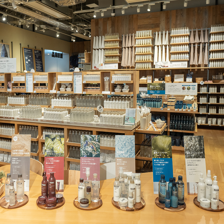 身体をケアするアイテムを幅広く揃える人気のコーナーです。化粧水から歯ブラシ・タオルや携帯ポーチまで、無印良品は毎日の生活を支える製品の開発を進めます。